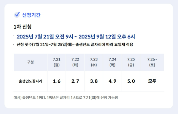- 신청 첫 주는 출생연도 끝자리 요일제 운영 (7/21~7/25)