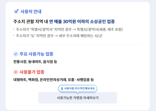 주소지 기준 지역 내 연 매출 30억 원 이하 소상공인 업종에서 사용 가능합니다.