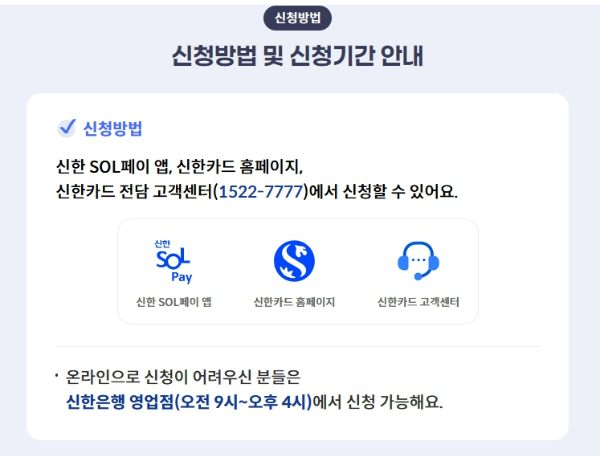| 4. 신한은행 영업점 방문 | 오전 9시~오후 4시까지 가까운 신한은행 지점 방문 접수 (신분증 지참 필수) |