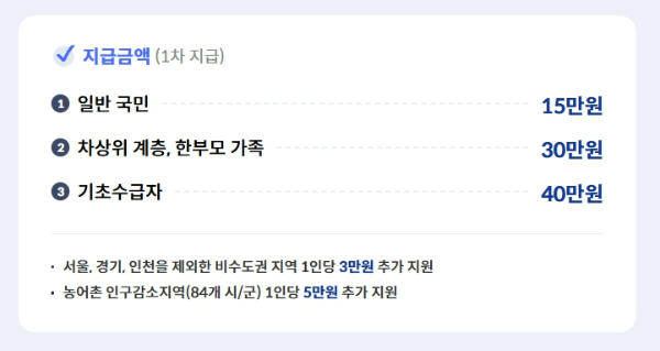 - 농어촌 인구감소지역 주민: 5만 원 추가지급 금액 (1차 기준)